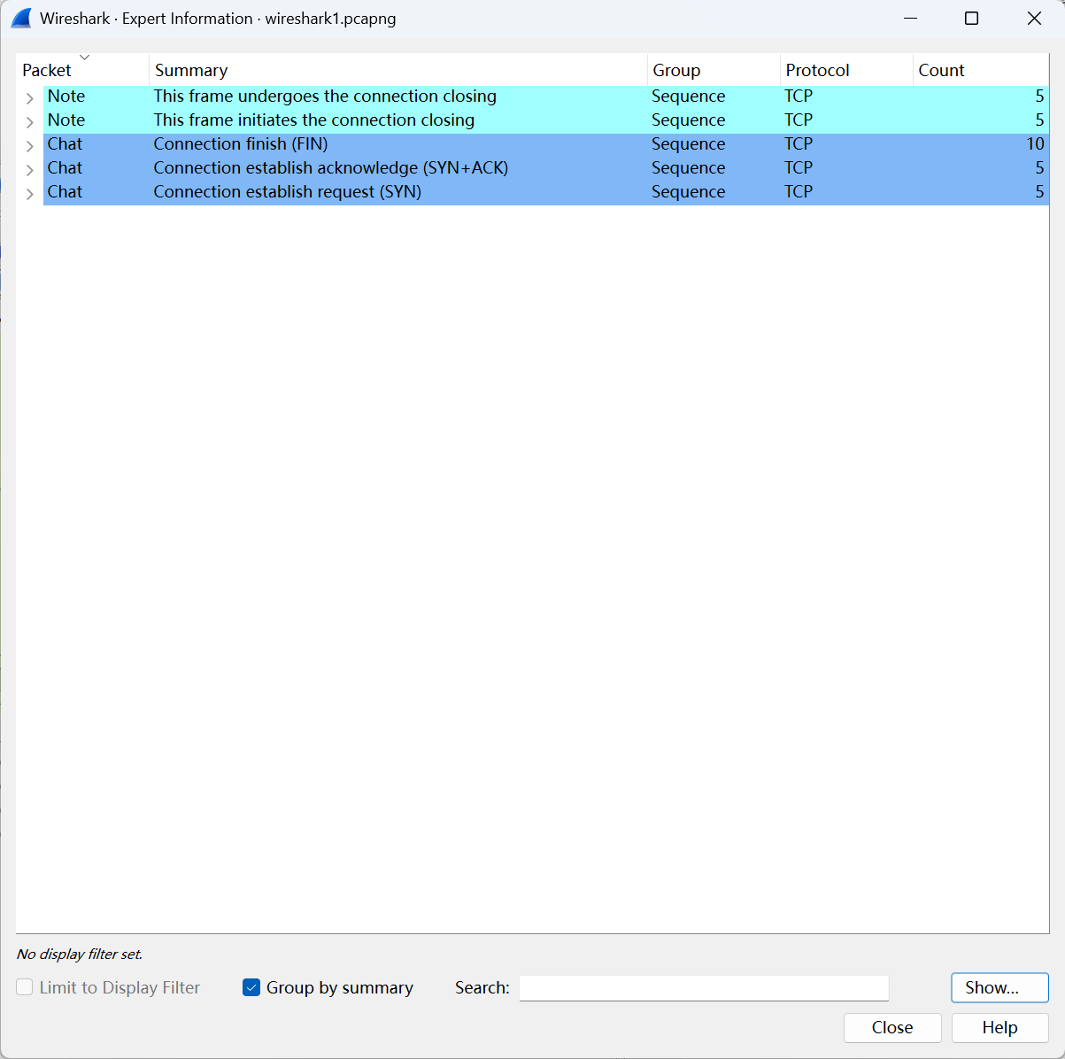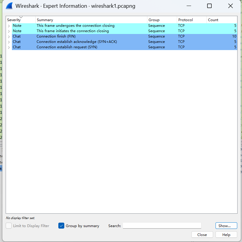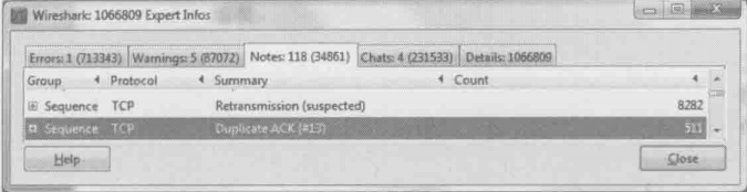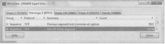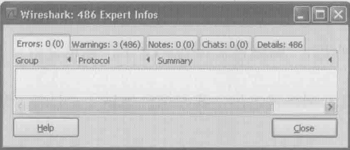 3.单机Analyze –>Expert Information,从Error和Warning里都没有看到报错,这说明网络没有问题(见下图)假如有重传、乱序之类的现象,应该能在这个窗口里看到
