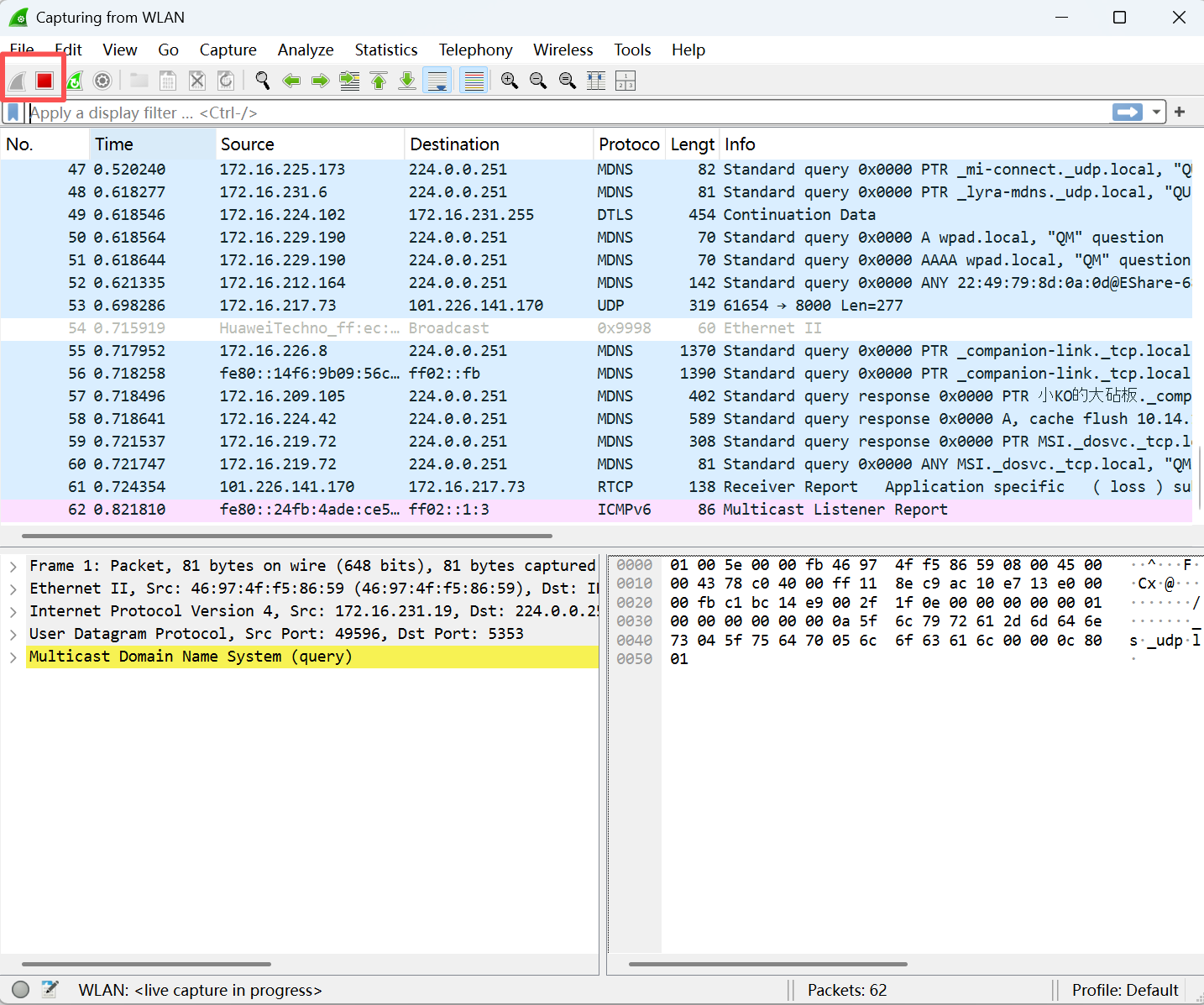 点击红色方块按钮来停止,或者点击鲨鱼鳍按钮来继续抓包