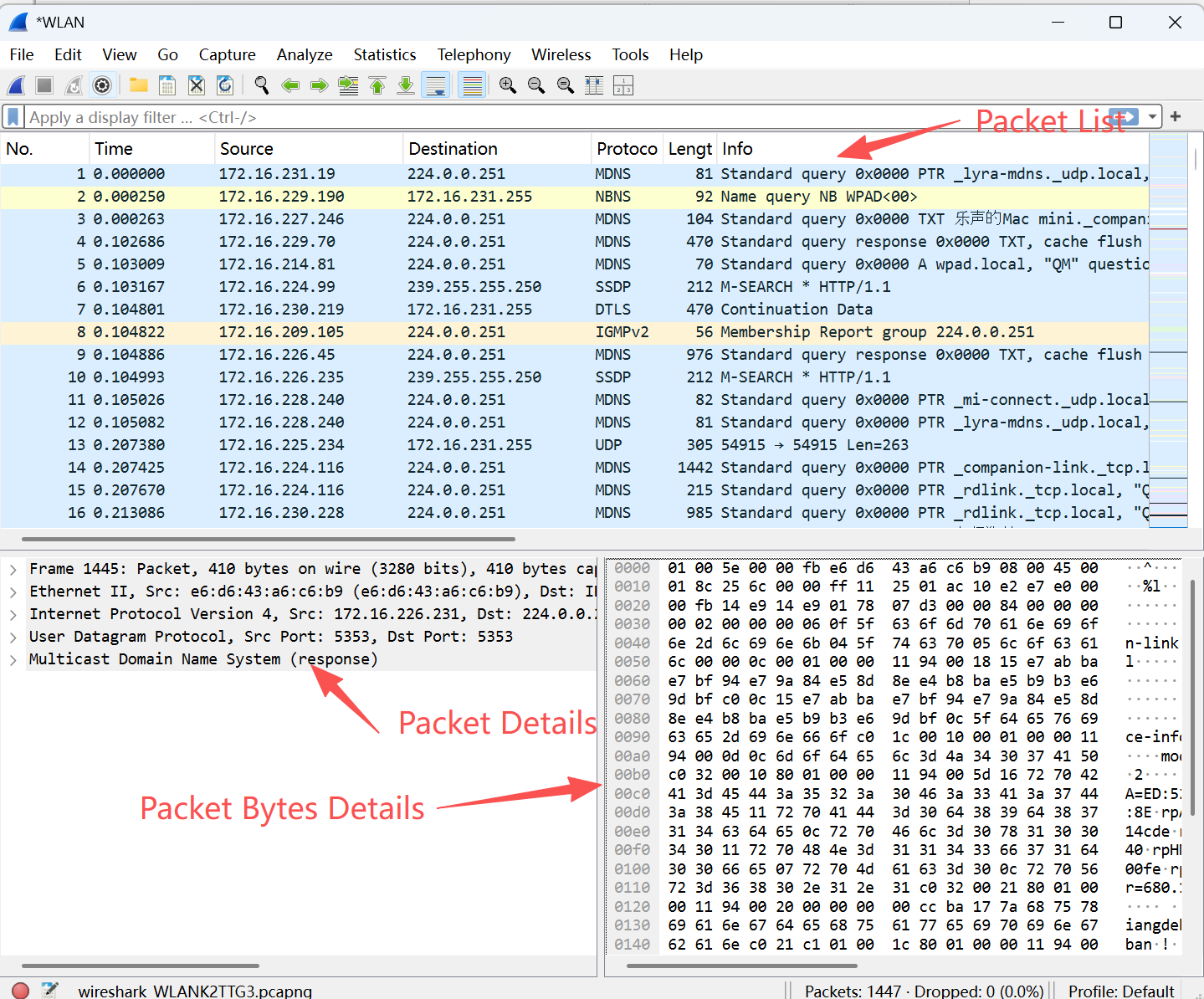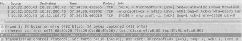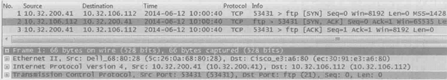 最上面是Packet List窗口,它列出了所有网络包,在Packet List中选定的网络包会详细地显示在中间的Packet Details窗口,最底下是Packet Bytes Details窗口,我们一般不会用到它