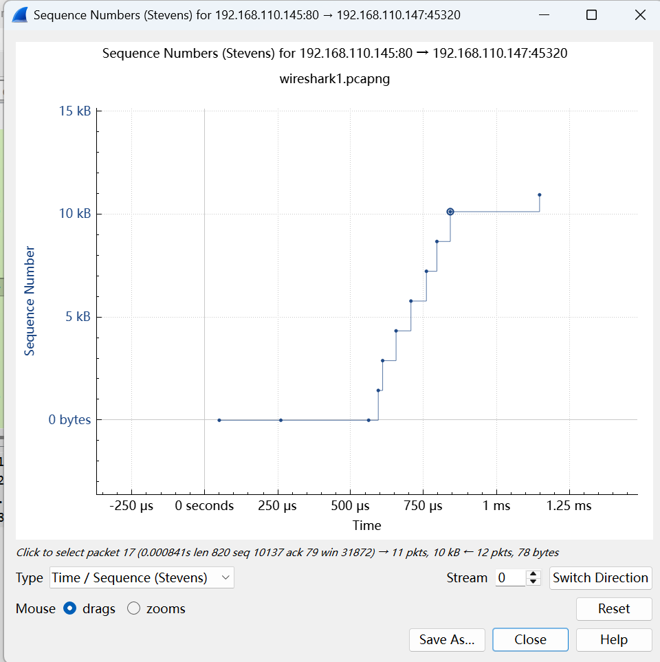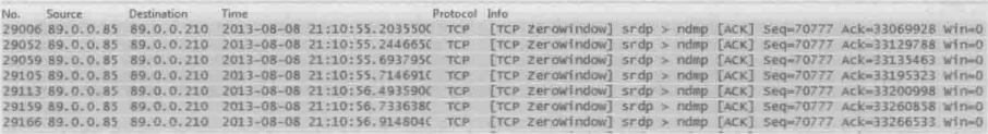 为了给客户出一份专业的分析报告,作者需要统计出”TCP Window=0“所导致的停止总共有多少毫秒。通过上图的很坐标来统计显然不够精确,所以作者不得不把所有的问题包过滤出来,逐段统计停滞的时间。像上图这样只有两端停滞时间的情况还好,碰到有几十段的时候就很费时了