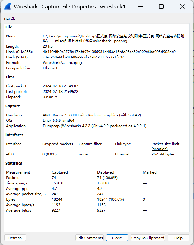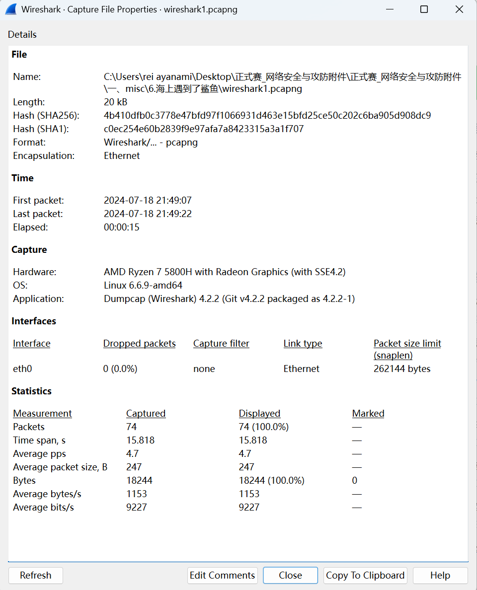 a.Summary(Capture File Properties)可以通过capinfos命令查询,如下图所示