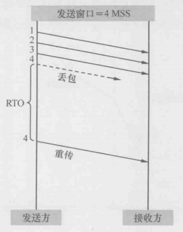 以上两个方案都需要选定一个较小的窗口值,这个值要怎么算出来呢?下图是一个丢包的例子,发送方一口气发出6个包,但其中最后一个丢失了,最后导致了超时重传