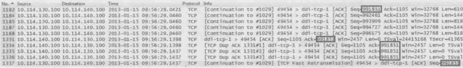 作者随机看了几个重传包,发现方向都是从Data Domain到AIX的。说明这些包从Data Domain出来之后,在路上丢失了,最终没有到达AIX。Data Domain因为一直没有等到AIX的确认包,所以只能选择重传