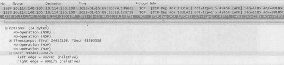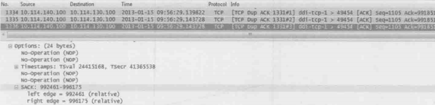 但是当作者检查接收方的网络包时,发现其实只有5190的原始包时真正丢失的,其他的包都到达了接收方,所以没必要重传。那为什么发送方要重传这么多呢?这是因为发送方发现5190的原始包丢失后,无法确定后续的其他包是否也丢了,只好选择全部重传而接收方虽然知道丢了哪些包,却没有任何机制可以告知发送方。这个问题其实在1996年的RFC2018中就已经给出了解决方案,它就是Selective Acknowledgment,简称SACK。在接收方和发送方都启用SACK的情况下,接收方可以告诉发送方”我没收到的只是5190的原始包,但是我收到了其他的。“因此发送方只需重传5190即可。在启用了SACK的网络包中,我们能在Dup Ack包里看到这些信息。下图是在一个启用SACK的环境中抓的包,最底部就是SACK信息