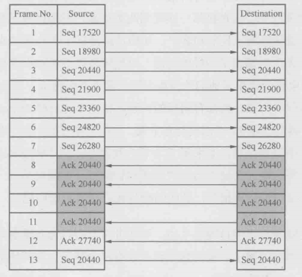 作者回忆起RFC中关于快速重传的描述:”当接收方收到比期望值大的Seq时,就要向发送方Ack 它期望的Seq值……“根据这个理论,难道接收方在收发票20440之前,已经收到了21900、23360、24820和26280这4个包?从Wireshark里看20440明明是排在这4个包前面的