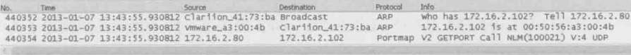 作者根据问题发生地时间点过滤出前后两秒钟地所有包,然后逐个检查。这下果然看到一个意想不到的包:如下图中的包号440354所示,NFS服务器172.16.2.80给客户端172.16.2.102发了一个Portmap请求,咨询其NLM进程的端口号。更异常的是这个请求竟然没有得到回复