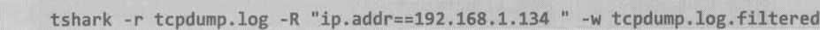 4.和其他软件一样,命令行往往比图形化界面快得多。比如现在有一个很大的包需要用IP 192.168.1.134过滤,用Wireshark操作的话先得打开包,再用ip.addr==192.168.1.134过滤,最后保存结果。这三个步骤都很费时,但是tshark用下面一条命令就可以完成了