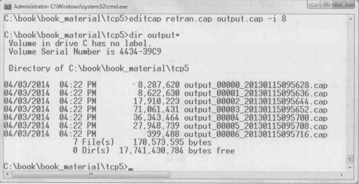 可以使用editcap命令来做到。作者常用”editcap -i“或者”editcap -c“两种方式。下图所示得例子以每8秒为间隔切分了这个包