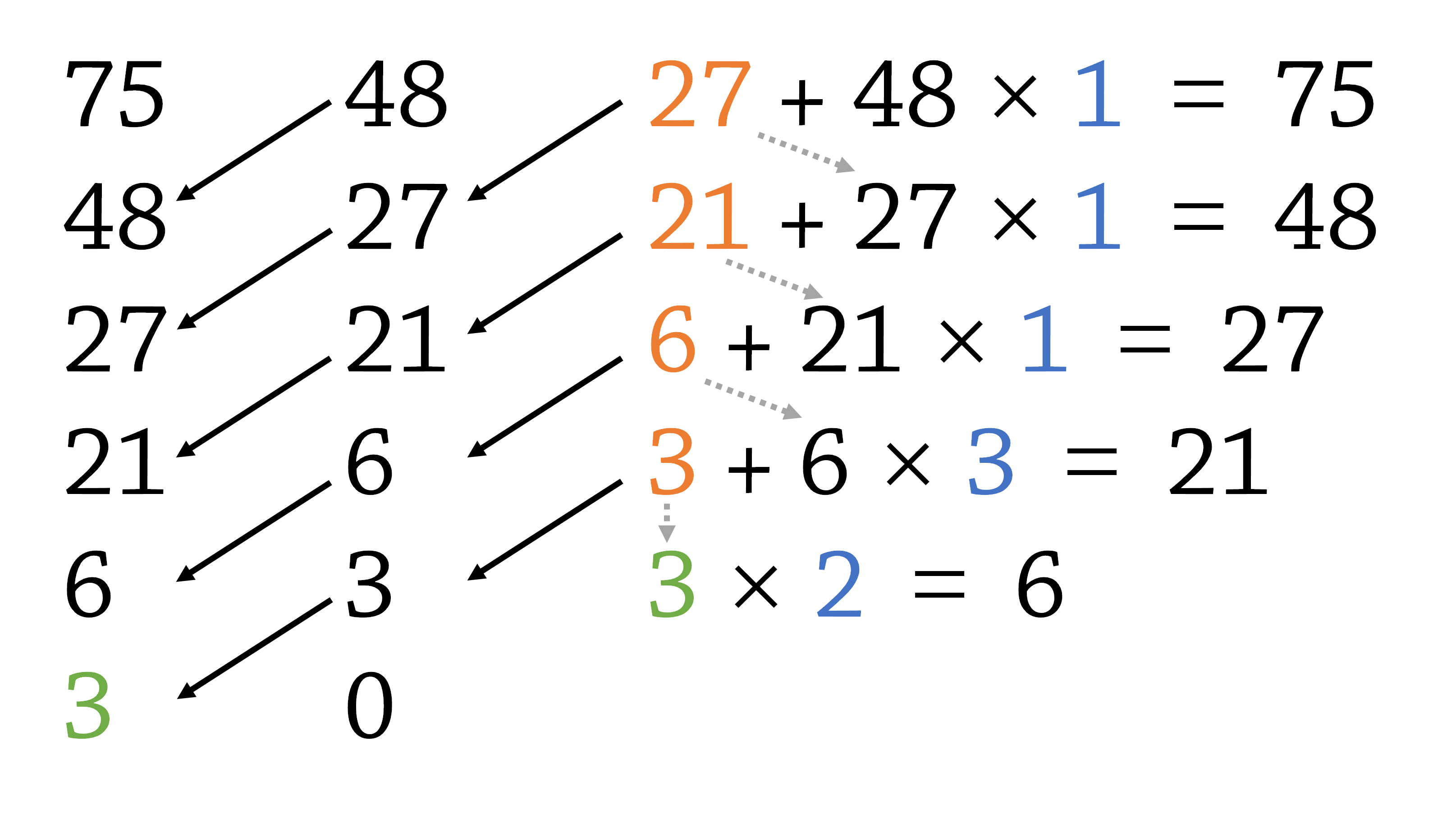 不妨设$ a>b $,设$ q=\left\lfloor \frac{a}{b} \right\rfloor $(相当于C++中的a/b),$ m=a\mod b $(相当于C++中的a%b),$ d_1 =gcd(a,b),d_2 = gcd(b,m) $,那么: