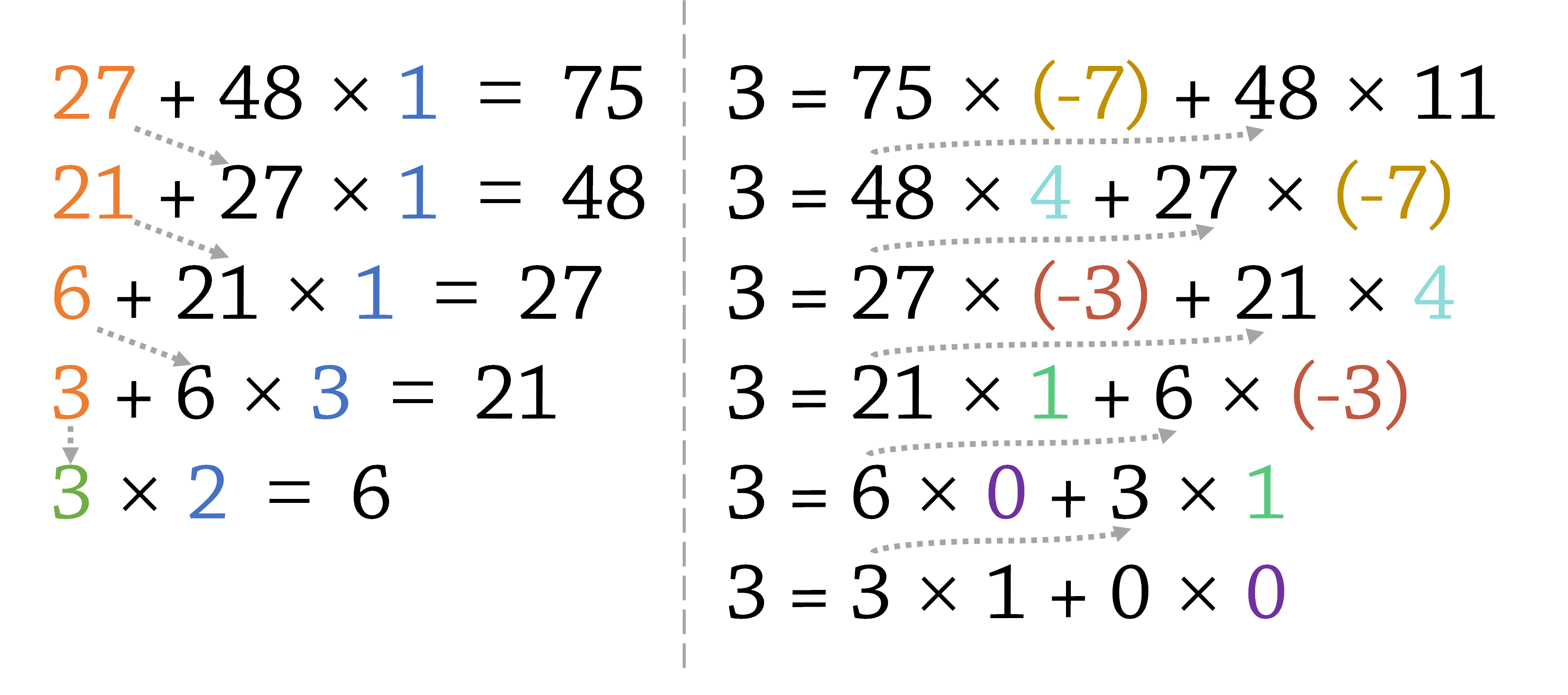 然后倒数第三行,$ 6+21 \times 1=27 $,说明6可以被表示为21和27的线性组合,那么3也就可以被表示为21和27的线性组合