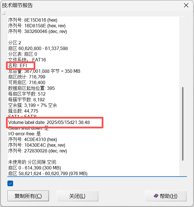 82.参考LEUNG_YL_USB.E01,以下哪项描述是正确的?i) 这是一个可引导U盘ii) 有一个分区标签名为 “EFI”iii) 卷标日期为 2025-05-15 (UTC +8)iv) 有一个分区的总容量小于 500 MB