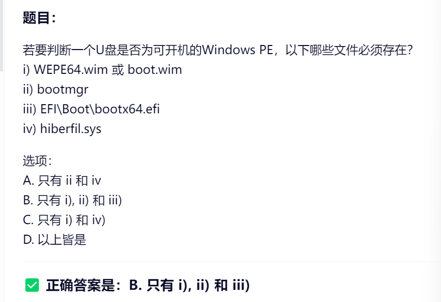 89.若要判断一个U盘是否为可开机的Windows PE,以下哪些文件必须存在?i) WEPE64.wim 或 boot.wimii) bootmgriii) EFI\Boot\bootx64.efiiv) hiberfil.sys